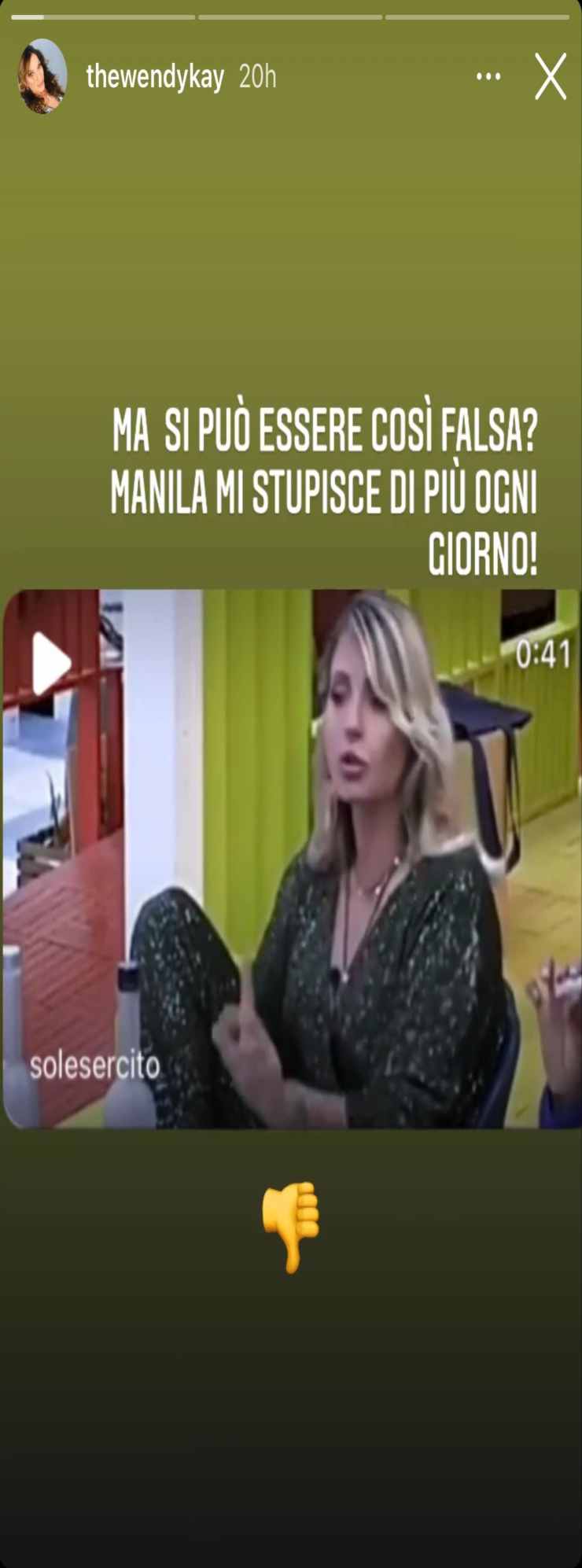 Wendy Kay ha pubblicato il video della chiacchierata avvenuta tra le due Vip, e ha commentato con parole forti i pensieri espressi da Manila su Delia Duran. Ecco cosa ha scritto: “Ma si può essere così falsa? Manila mi stupisce di più ogni giorno!”.